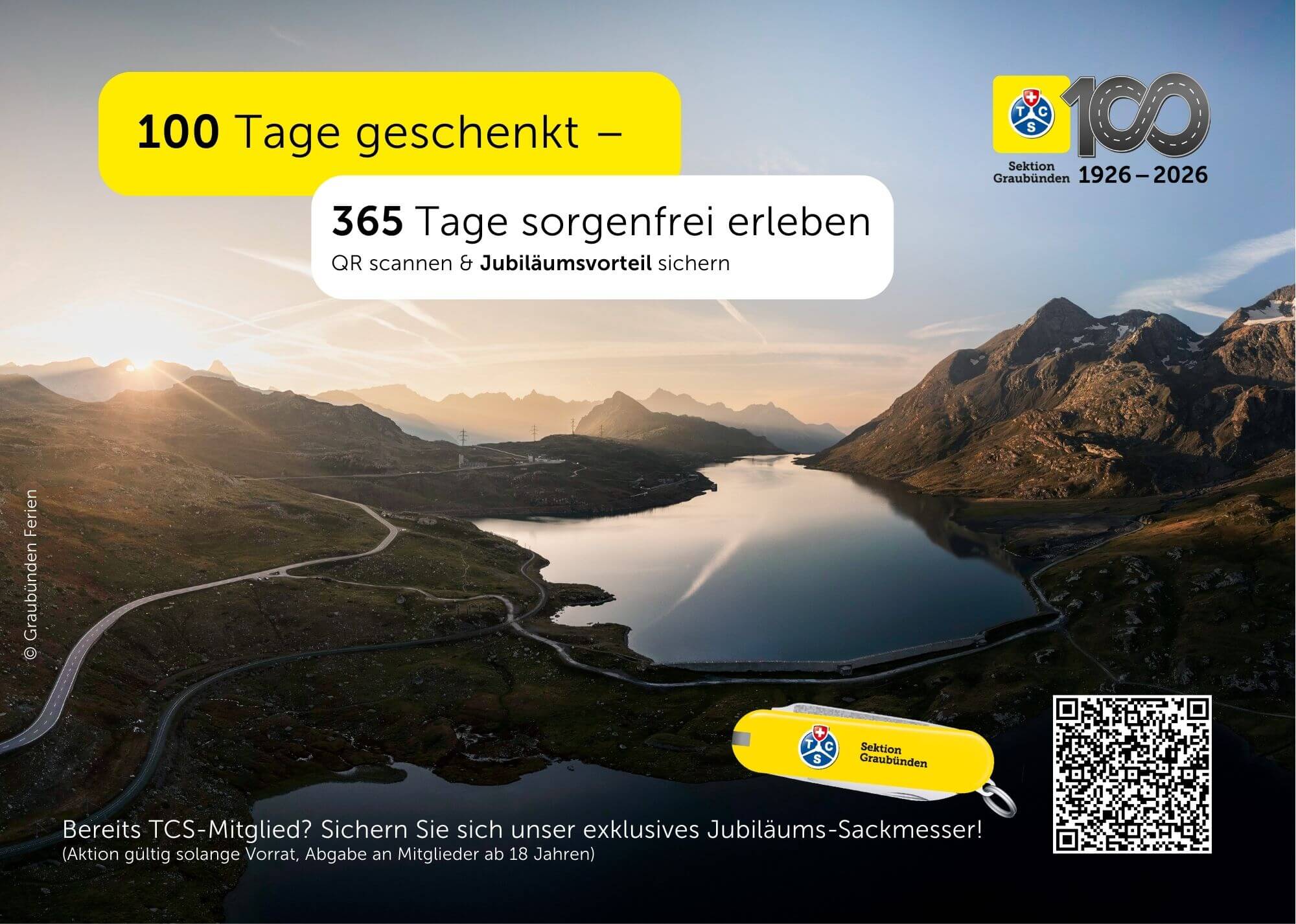 100 Jahre TCS Graubünden bedeuten Tradition, Entwicklung und Zusammenhalt. Und sie bedeuten auch: Wir bleiben in Bewegung – mit einem entschlossenen Blick auf die Chancen und Herausforderungen der Mobilität von morgen. Das Jubiläum der TCS Sektion Graubünden ist für uns ein bedeutender Meilenstein.